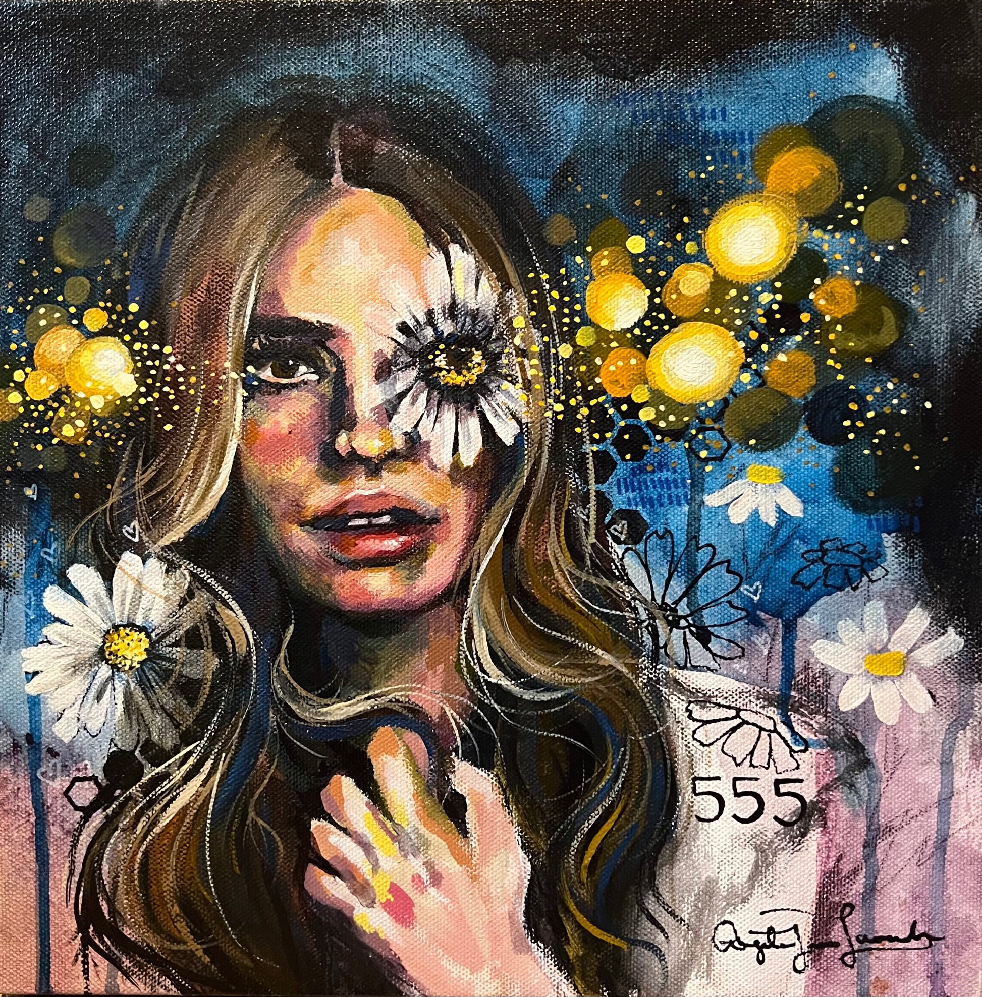 “Spellbound” invites you into a mesmerizing world where light, colour, and magic collide. This enchanting mixed-media piece features a powerful, ethereal woman surrounded by vibrant daisies and glowing golden orbs, symbolizing intuition, transformation, and universal guidance. With the number “555” subtly woven into the piece, it signifies change, freedom, and personal growth. Every stroke is a celebration of boldness and inner radiance. Let “Spellbound” inspire you to embrace the magic within and illuminate your space with its captivating beauty.