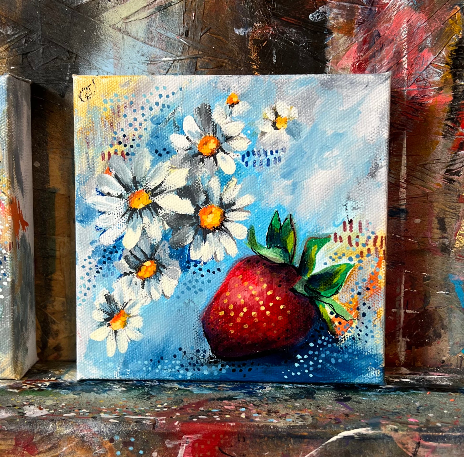 “Sunbathing,” from Angela Jane Lavender’s Reincarnate series, is a playful celebration of life’s simple joys. A vibrant strawberry rests alongside cheerful daisies, basking in the glow of sunlight and exuding warmth and abundance. The intricate layering of textures and bold colours captures a fleeting moment of harmony between nature and light, symbolizing growth, nourishment, and vitality.