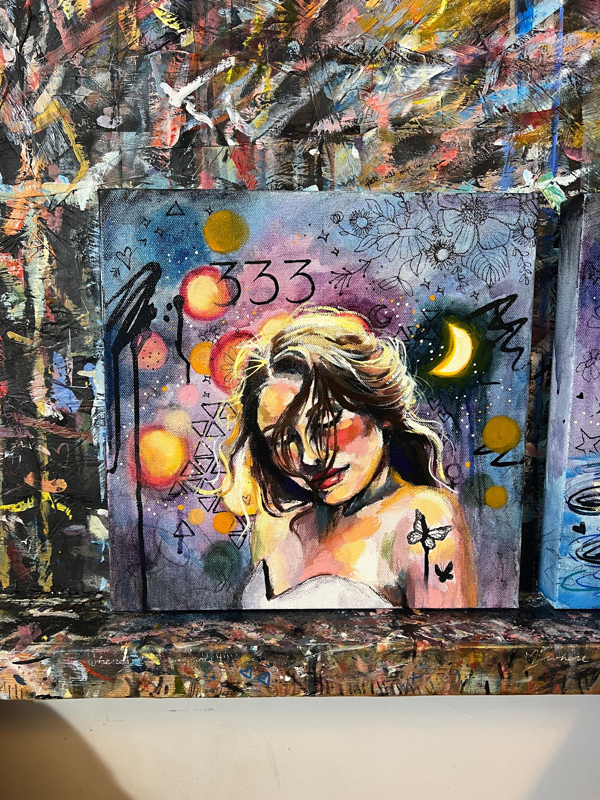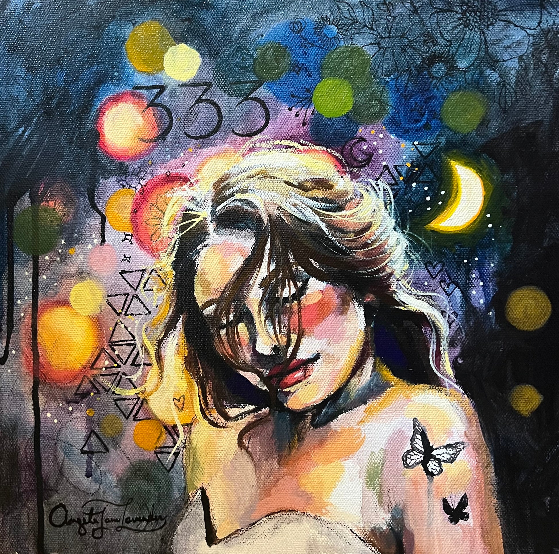 "True Alignment” is a vibrant mixed media painting that embodies the essence of harmony, divine connection, and personal growth. Featuring the angel number 333—symbolizing alignment, guidance, and encouragement—this artwork invites you to embrace your true path. Layers of rich colour, geometric patterns, and celestial elements like the crescent moon and delicate butterflies weave a story of balance and self-discovery.
