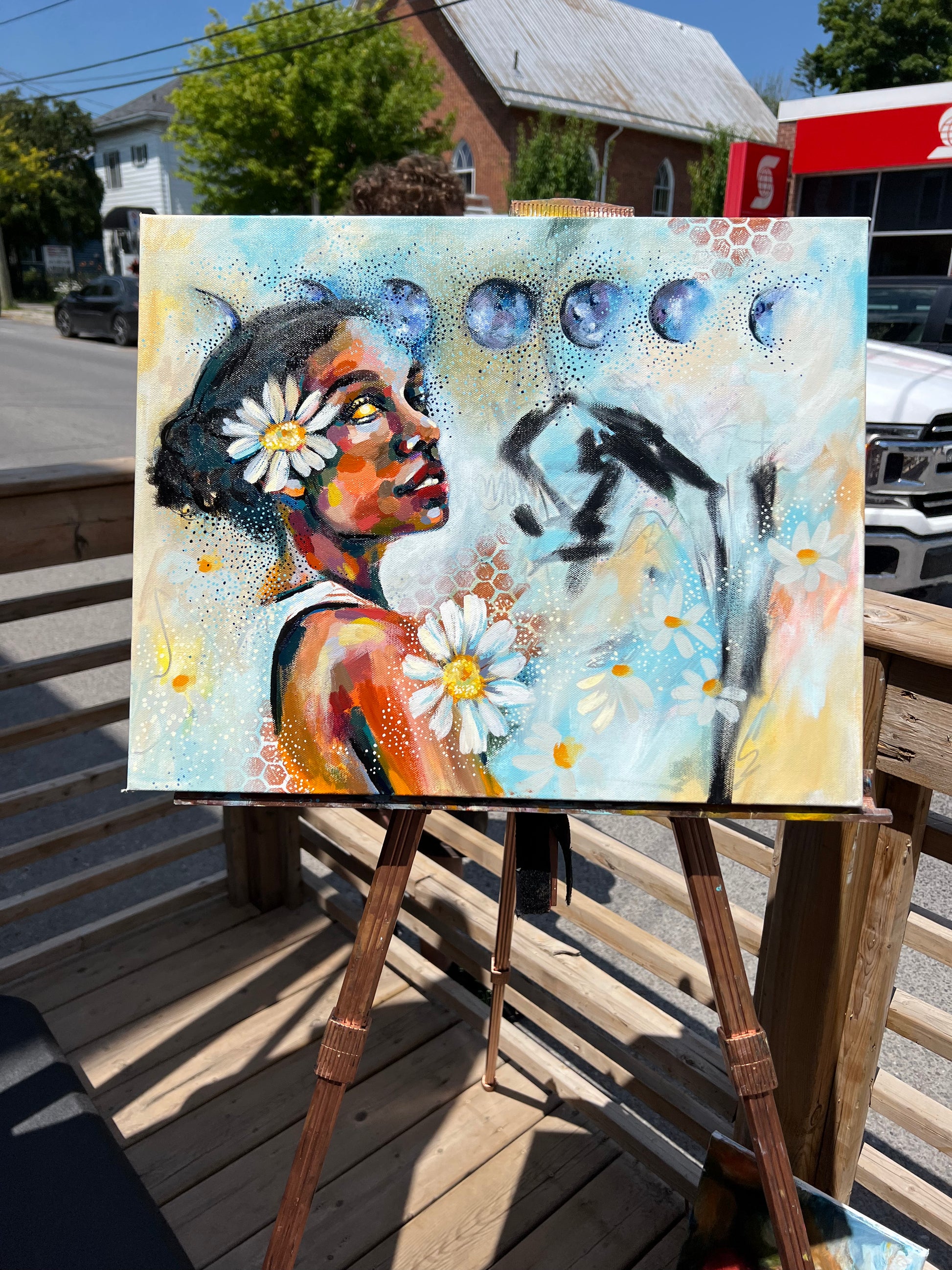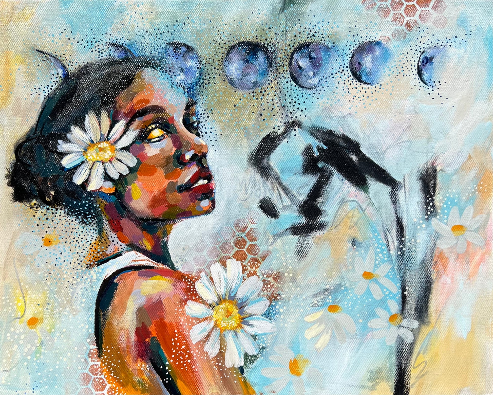"Unphased” is a piece that holds a deep meaning for me. The phases of the moon remind me of how life is always changing, yet there’s beauty in every stage if we allow ourselves to embrace it. The daisies scattered across the canvas symbolize resilience and new beginnings—a quiet strength that grows even in the most unexpected places.