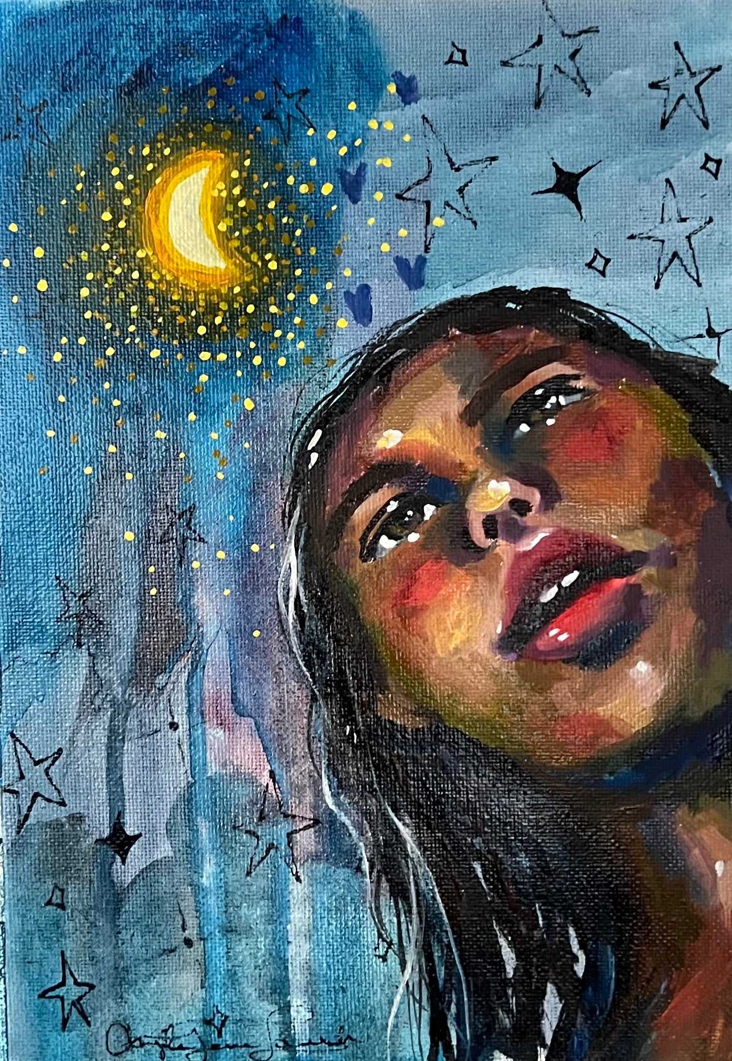 This figure is drenched in starlight and dew, making quiet wishes beneath the moon. Her gaze reaches toward the heavens, where her wildest dreams live and wait. Ethereal and radiant, she exists in that luminous space between hope and becoming.