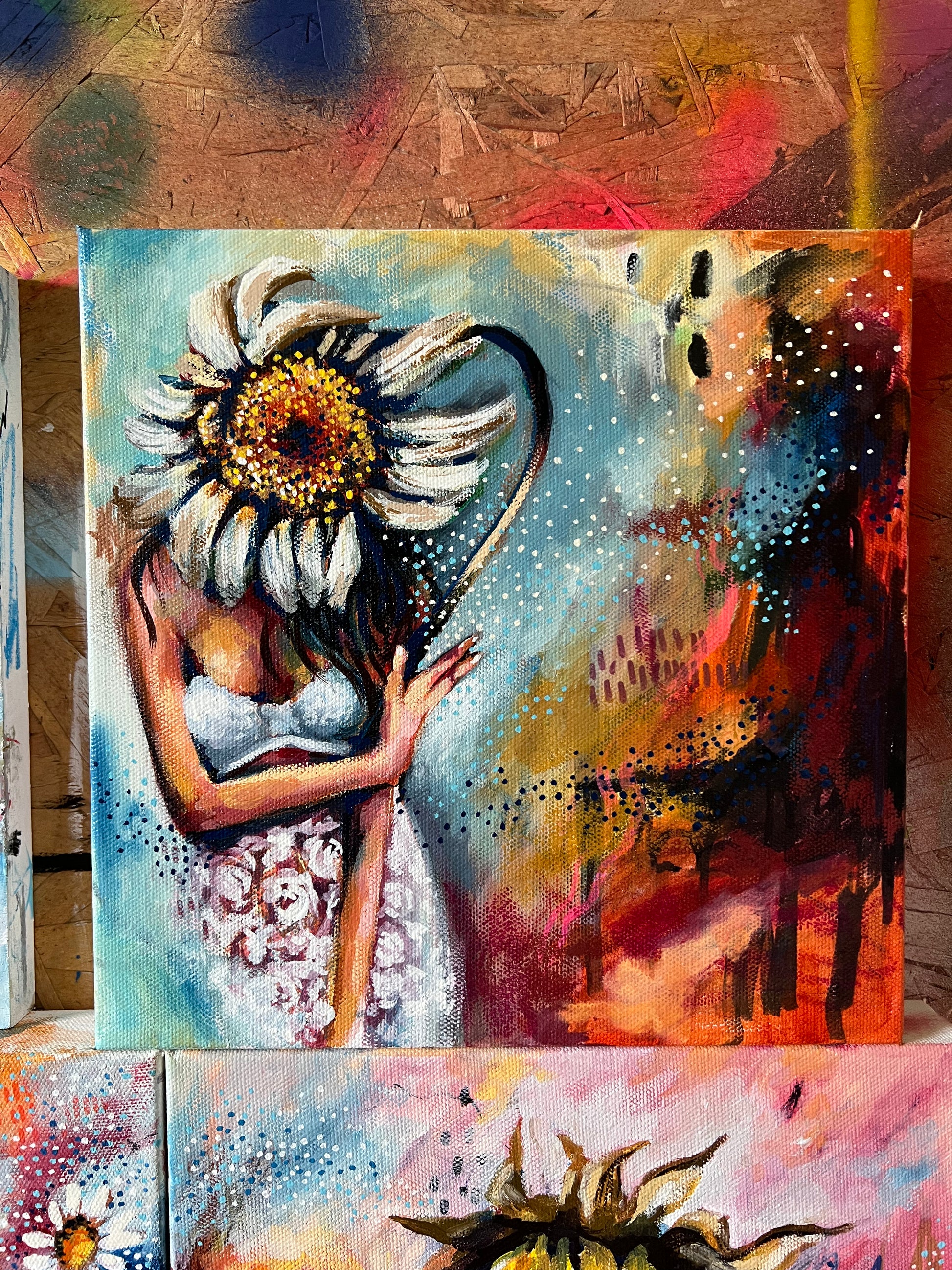 This painting depicts the passage of time and the affect losing youthful looks has on a woman. It validates the experience and mimics the wilting flower; which is of course still beautiful but in a completely different way. This piece strives to showcase the impact that each person, each living thing, has on the world around them.